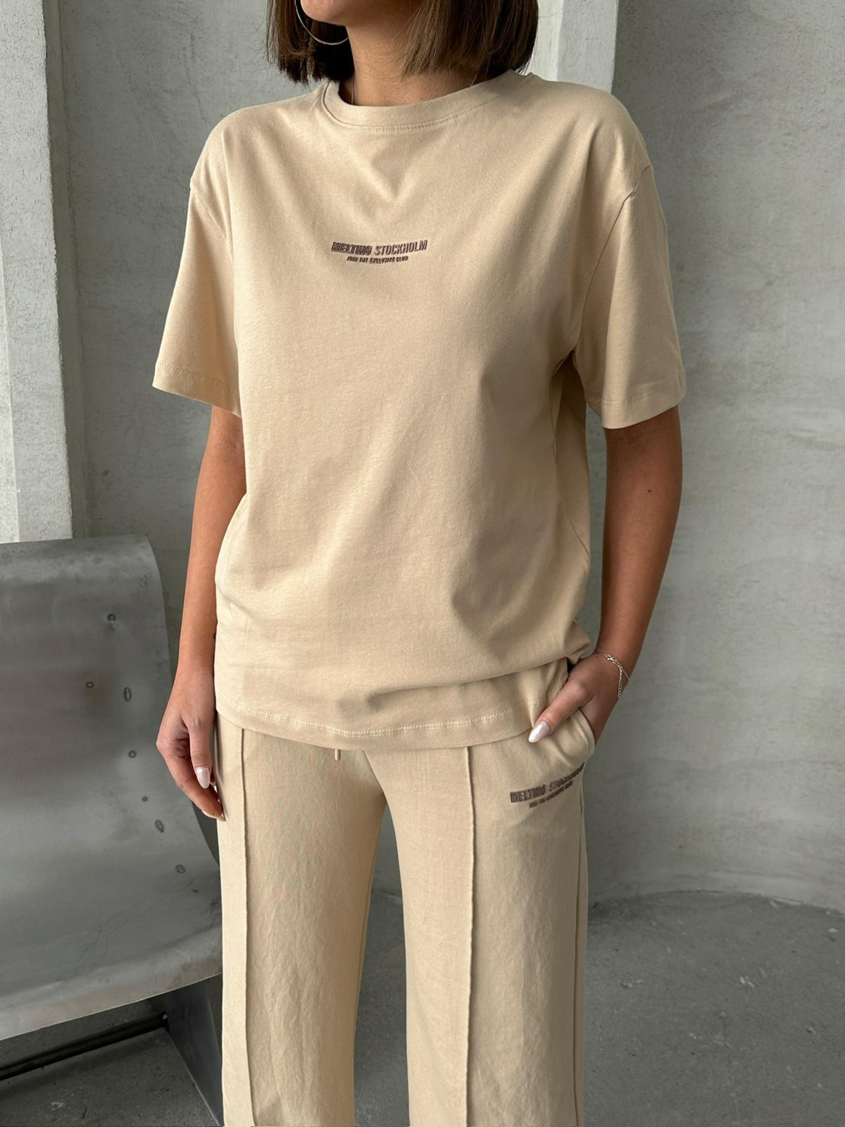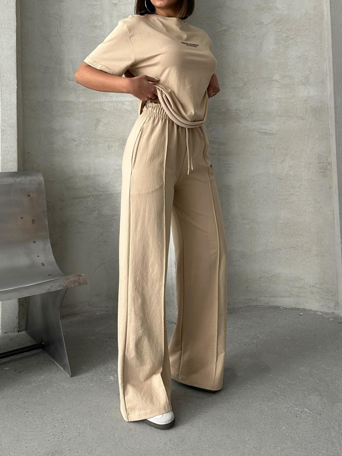 Takım, modern kesimi ve çarpıcı detaylarıyla öne çıkıyor. Üst kısım, yumuşak dokusu sayesinde vücut hatlarını zarif bir şekilde sararken, palazzo pantolonlar ise sağladığı geniş kesim ile hareket özgürlüğü sunar. Renk paletindeki pastel tonları, ferah bir görünüm yaratırken, özel çizgiler ve dikiş detayları stilinize sofistike bir dokunuş katıyor.