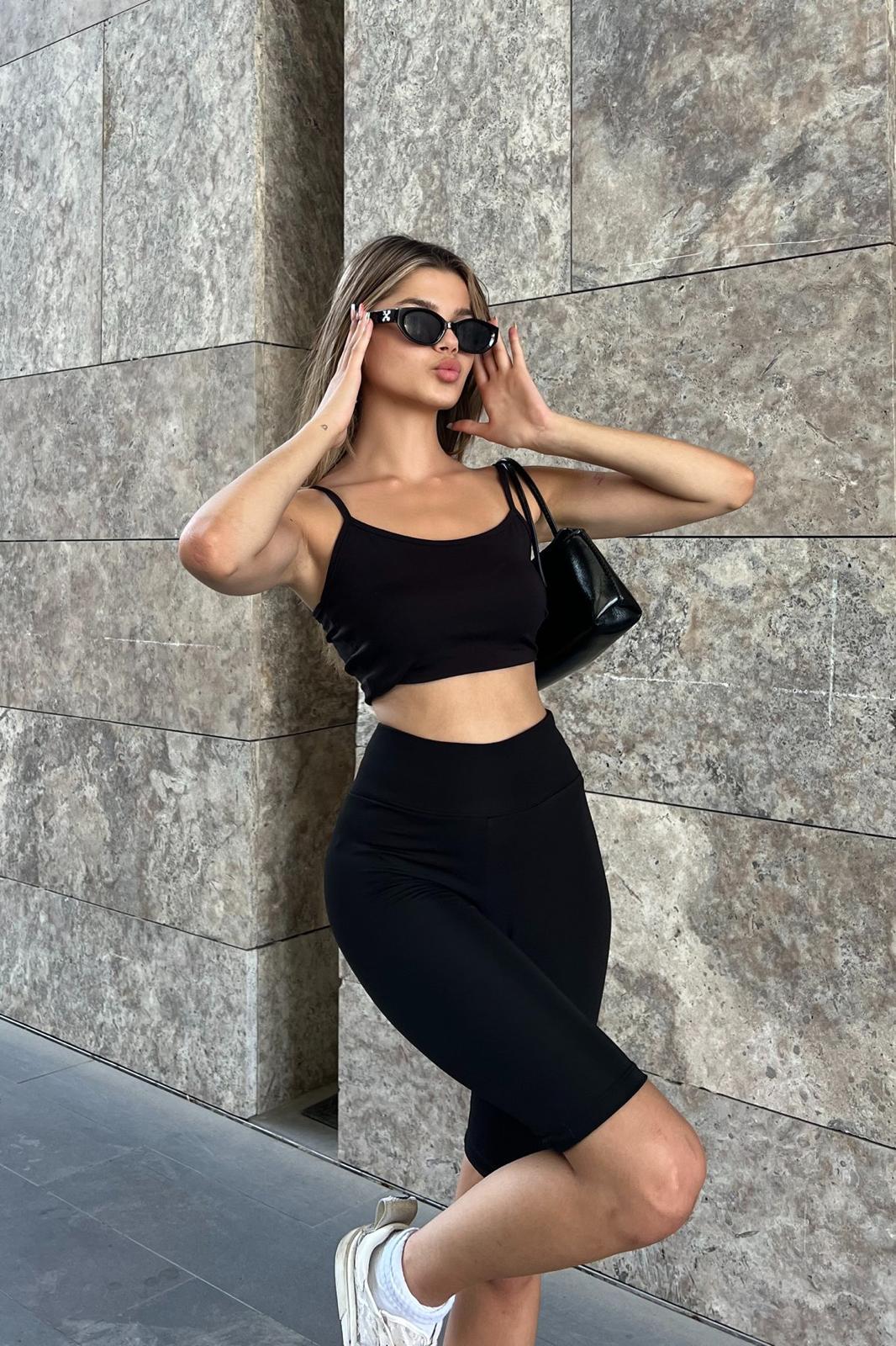 Yüksek Bel Toparlayıcı Kısa Spor Biker Tayt - Siyah